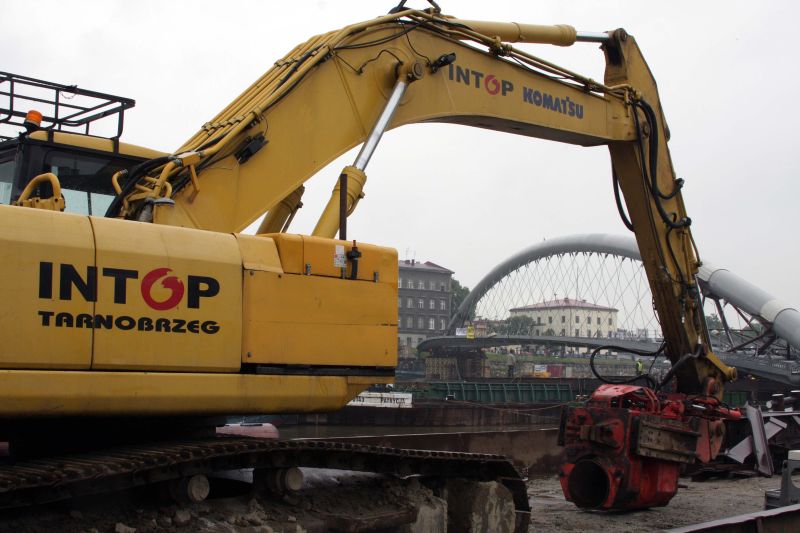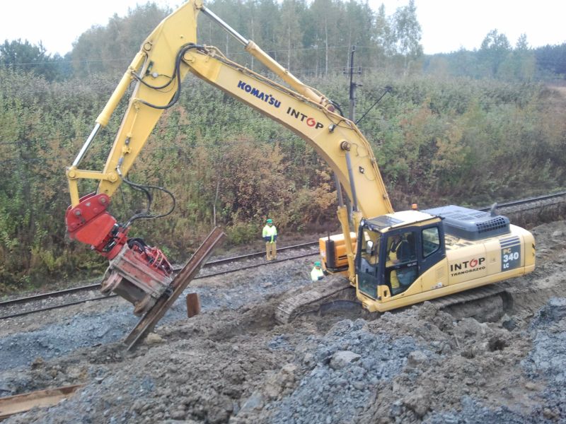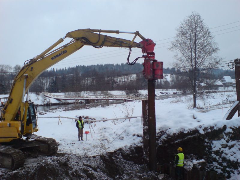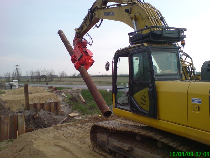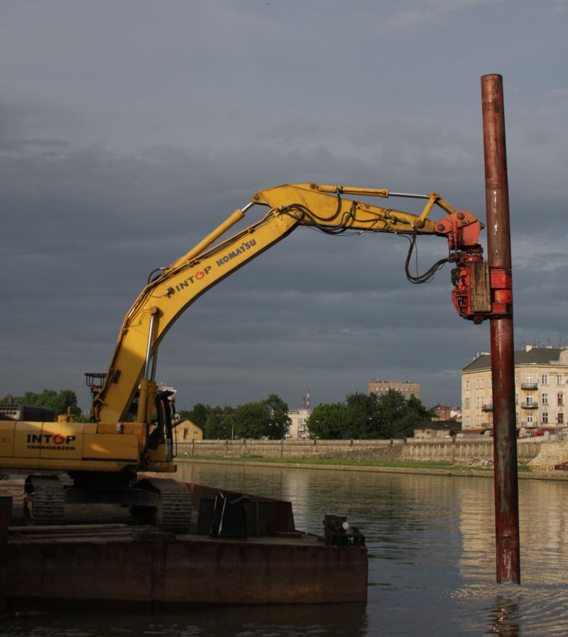 Do wykonywania ścianek szczelnych stosujemy grodzice stalowe, które pogrążamy w grunt wibromłotem MOVAX SPH-80 na podwoziu gąsienicowym KOMATSU PC340LC.
